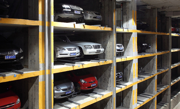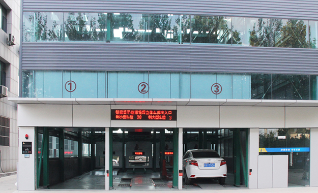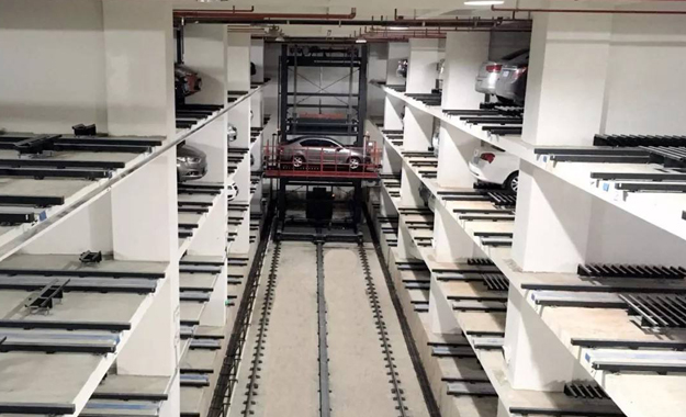 在兩側(cè)泊位的中央設有巷道堆垛機,整個車庫的運行均由堆垛機和搬運器來完成。汽車入庫時,汽車停在出入庫臺上,堆垛機從出入庫臺上取走汽車后在巷道內(nèi)行走并提升,將汽車運送到指定層的泊位旁,堆垛上的搬運器將汽車從堆垛機送入泊位,堆垛機利用先進技術無縫整合了升降和行走兩套系統(tǒng),并配備變頻控制系統(tǒng),采用激光測距來行走定位,采用光通訊無線信號傳送,實現(xiàn)邊行走邊升降的功能以達到節(jié)約時間、降低能耗和空間利用最大化的目的。