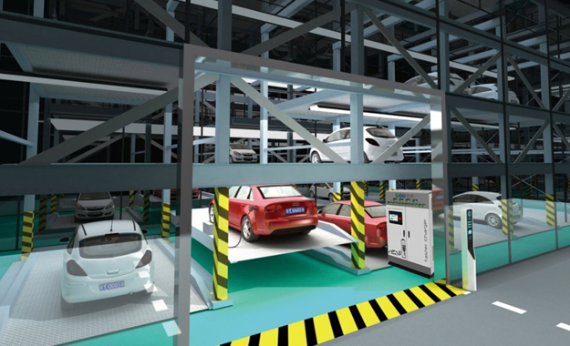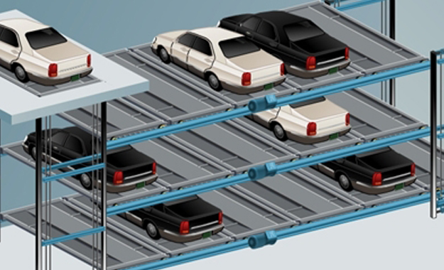 多層循環(huán)類立體車庫通過載車板左右移動和上下移動的相互配合使載車板循環(huán)運動,從而實現車輛多層存放。