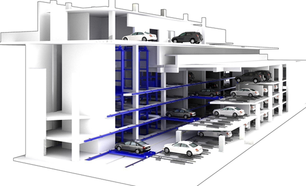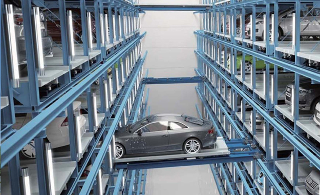 平面移動類產品是在同一水平層上用搬運器平面移動汽車或載車板,實現(xiàn)存取汽車的機械式停車設備,多層平面移動類停車設備還需要升降機來實現(xiàn)不同層間的升降。設備內利用激光測距來行走定位,采用光通訊無線信號傳送,變壓變頻(VVVF)驅動和微機控制方式使整座車庫實現(xiàn)低振動、低噪聲、低成本和高效率的運行。可內置自動升降旋轉裝置,配以先進的導航指示,無須司機倒車,自動化程度高,有著其他類型車庫無法比擬的技術優(yōu)點。